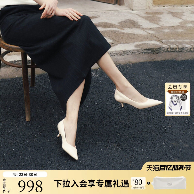 董洁同款真美诗亲肤鞋2026春季牛皮尖头柔软褶皱白色单鞋高跟鞋女