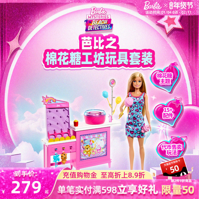 芭比娃娃Barbie棉花糖创意工坊玩具套装女孩穿搭过家家职业体验