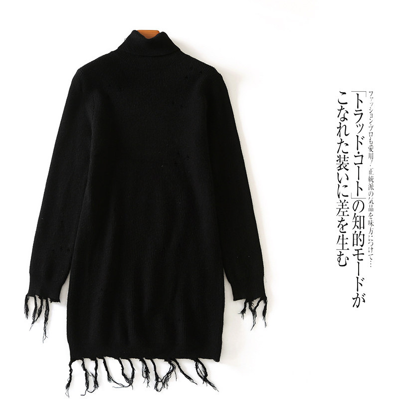 外贸韩版女士毛衣秋冬新款高领修身显瘦破洞设计中长款打底针织衫