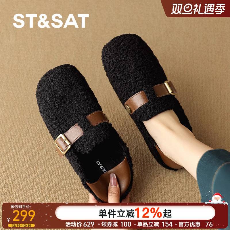 星期六加绒乐福鞋女款2025秋冬新款懒人一脚蹬保暖平底毛毛棉鞋爆