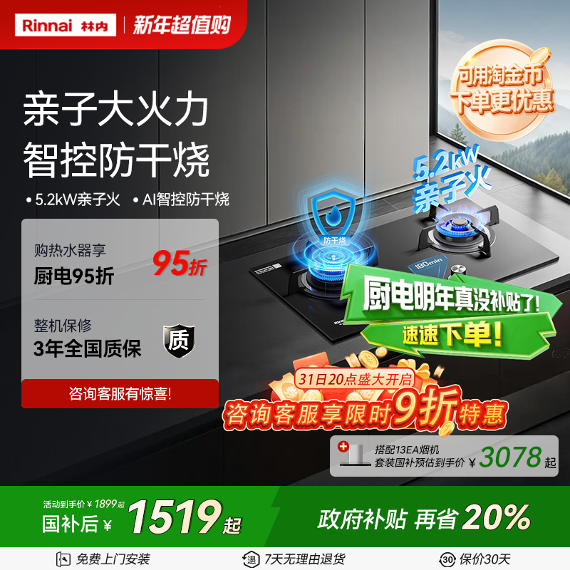 新品上市林内Rinnai烟灶套装亲子火定时防干烧2EHQS1/QS2+13EA