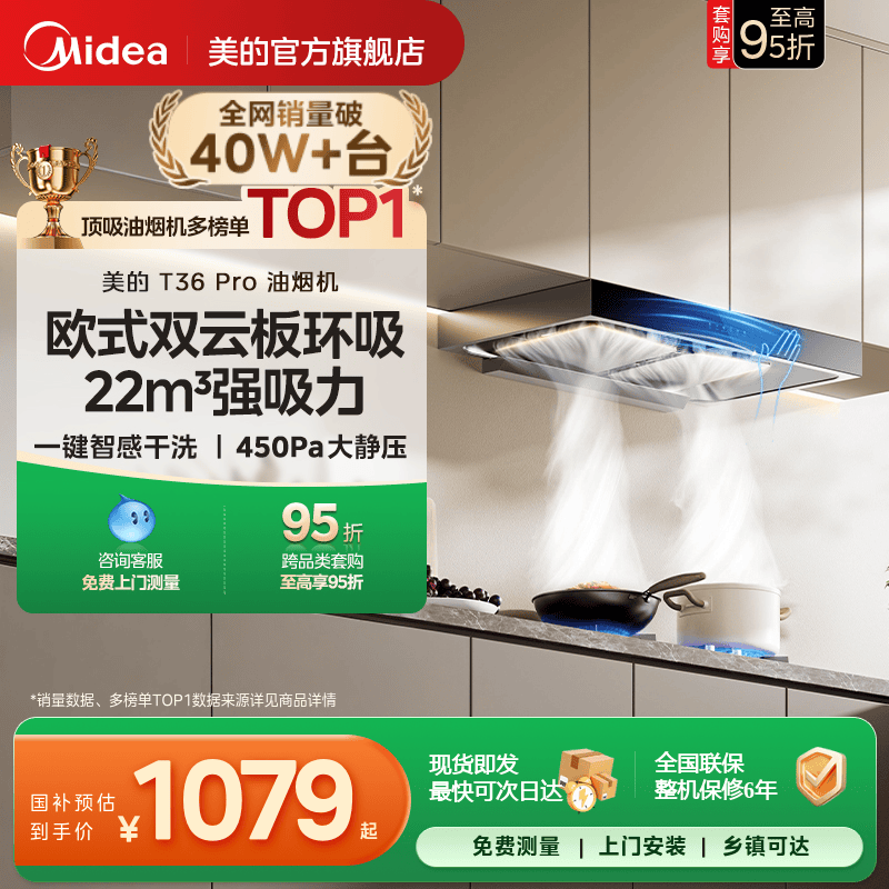 美的官方抽油烟机T36PRO家用厨房欧式顶吸自清洁吸油烟机烟灶套装
