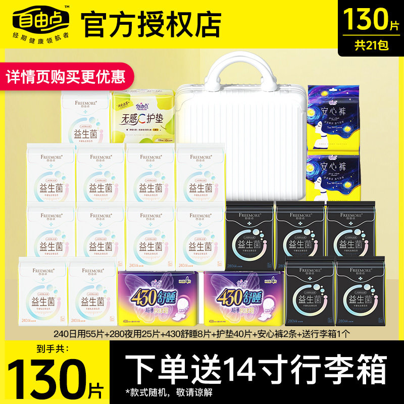 自由点益生菌卫生巾日夜用组合130片囤货姨妈巾正品赠加大行李箱