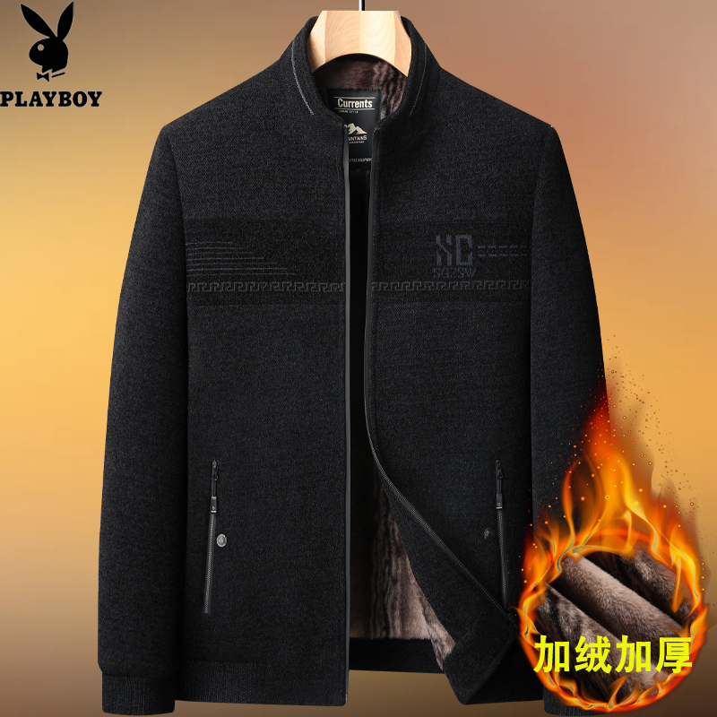 花花公子爸爸秋冬外套冬季棉衣男加绒加厚棉服爷爷翻领保暖夹克衫