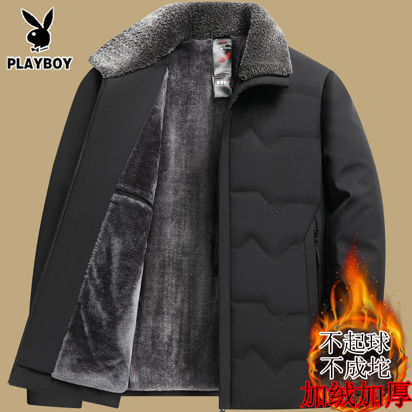 花花公子男士翻领夹克秋冬季棉衣休闲潮2025新款加绒加厚保暖外套
