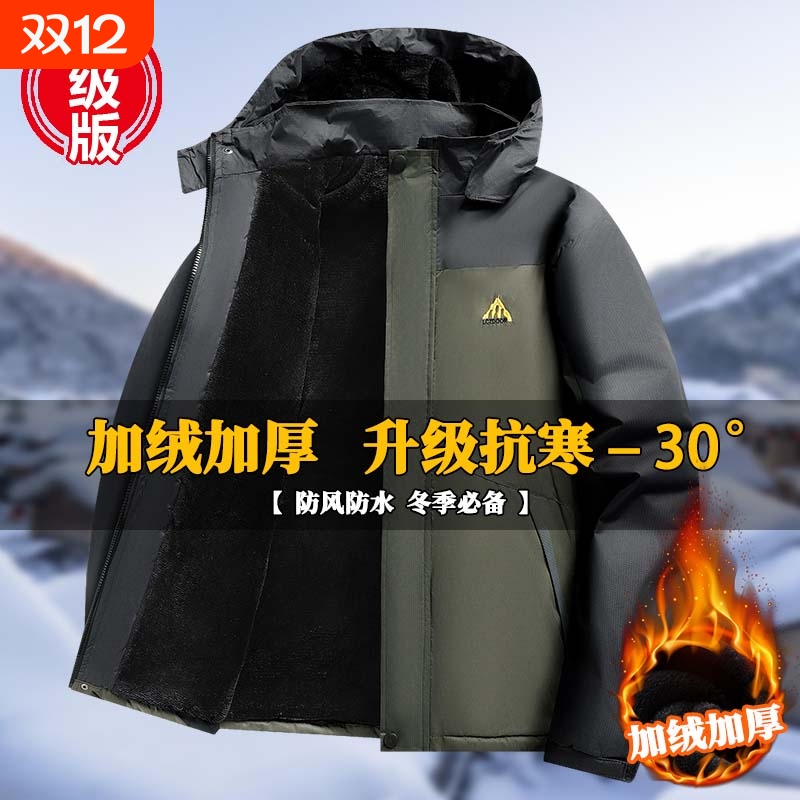 加绒加厚男士外套秋冬季防风防水冲锋衣夹克连帽保暖防寒男装上衣