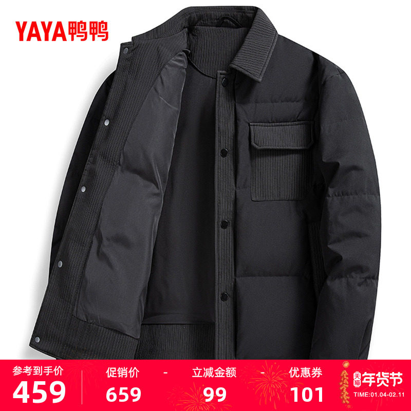 鸭鸭羽绒服男士2025年秋冬反季短款翻领简约时尚休闲衬衫领外套A