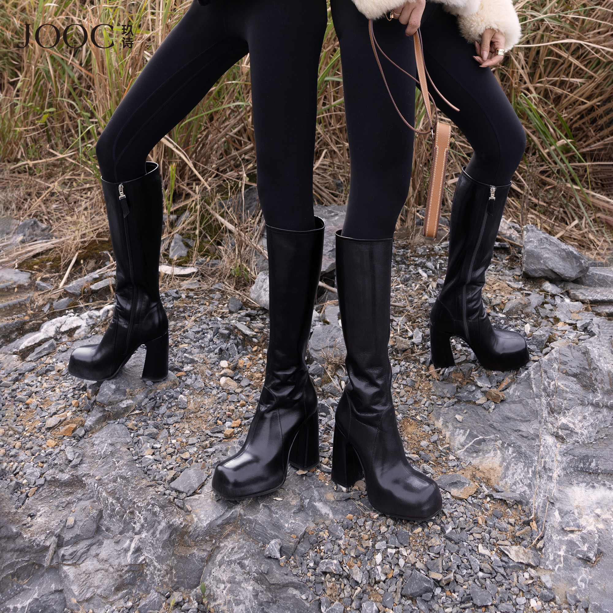JOOC玖诗高跟方头气质厚底长靴女2025冬季新款防水台粗跟高筒靴