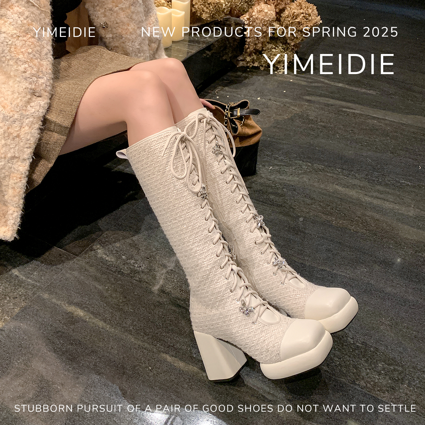 小香风系带厚底粗跟高筒靴女长靴2025冬新款拼接防水台高跟时装靴