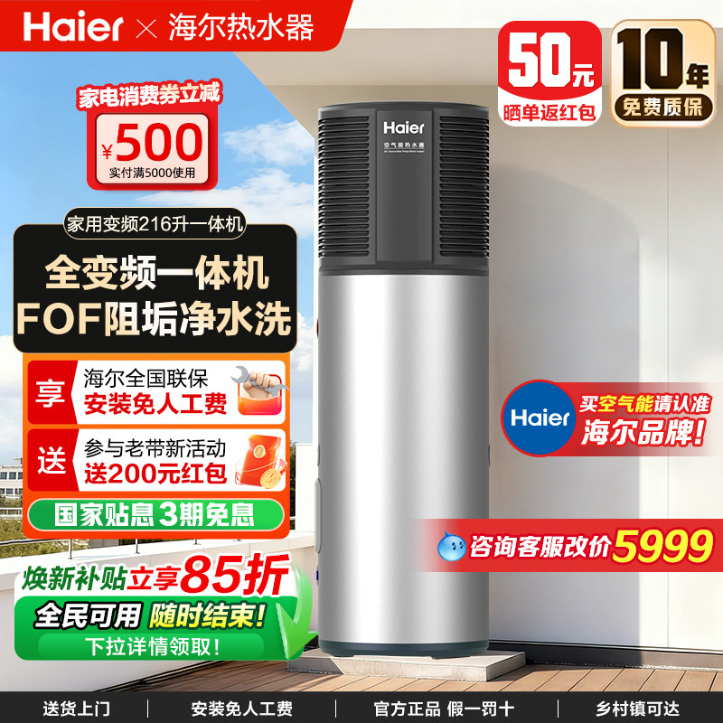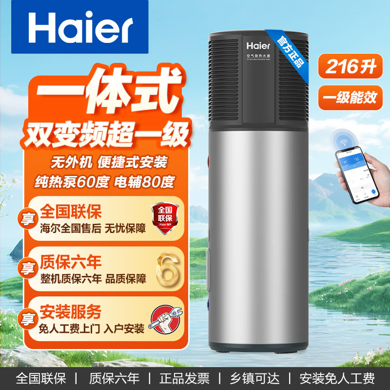 海尔变频216升一体式一级能效空气能热水器无外机便捷安装省空间