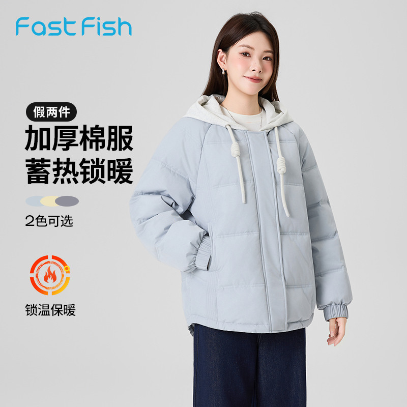 快鱼棉服女款2025新款假两件针织帽拼接面包服舒适保暖加厚棉衣