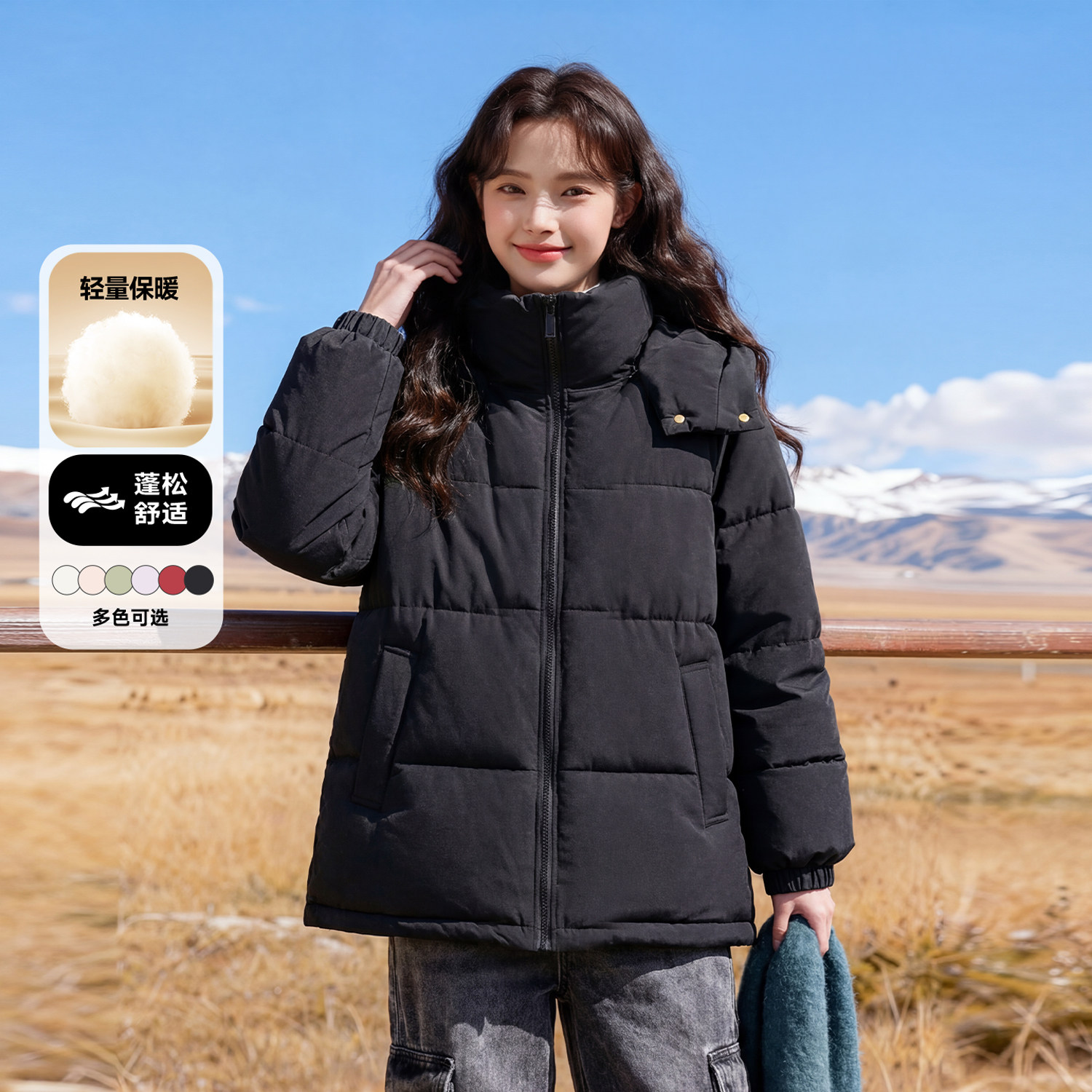 班尼路连帽棉服女款2025新款冬季加厚保暖棉袄宽松百搭短面包服N
