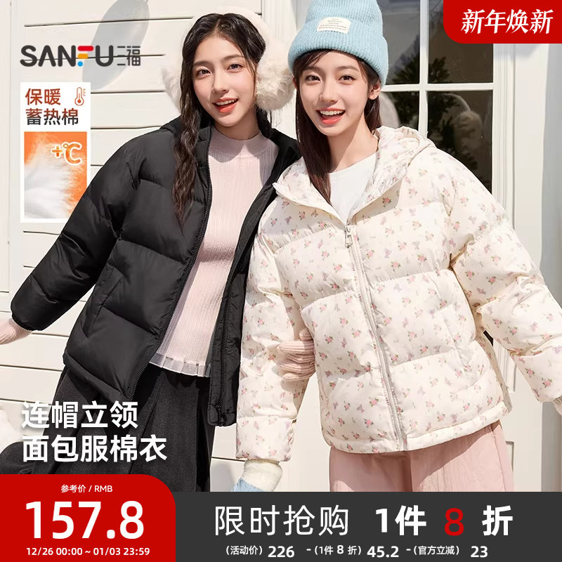 三福棉服女款2025新款冬季连帽宽松碎花棉衣保暖休闲棉袄外套女装