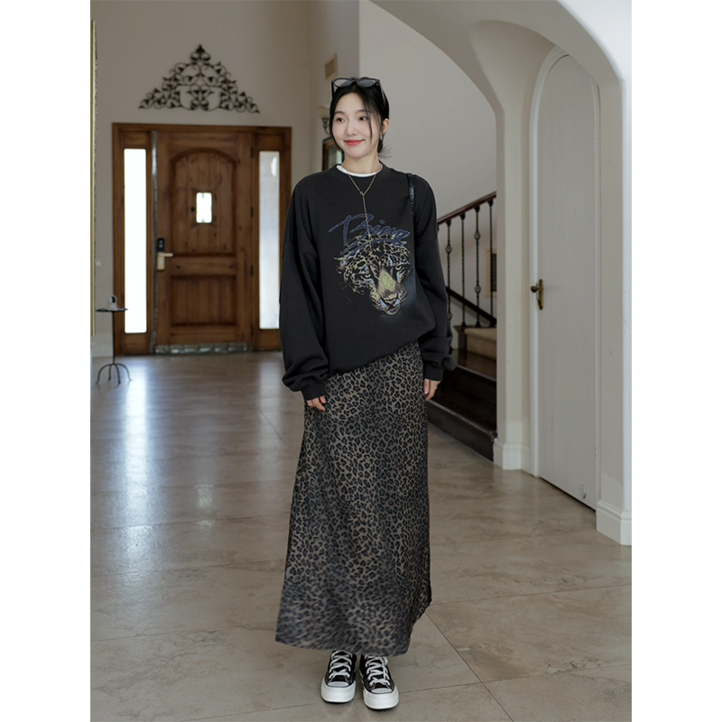 郭九九呢棉时髦印花宽松显瘦卫衣百搭上衣秋季豹纹锻面半身裙长裙