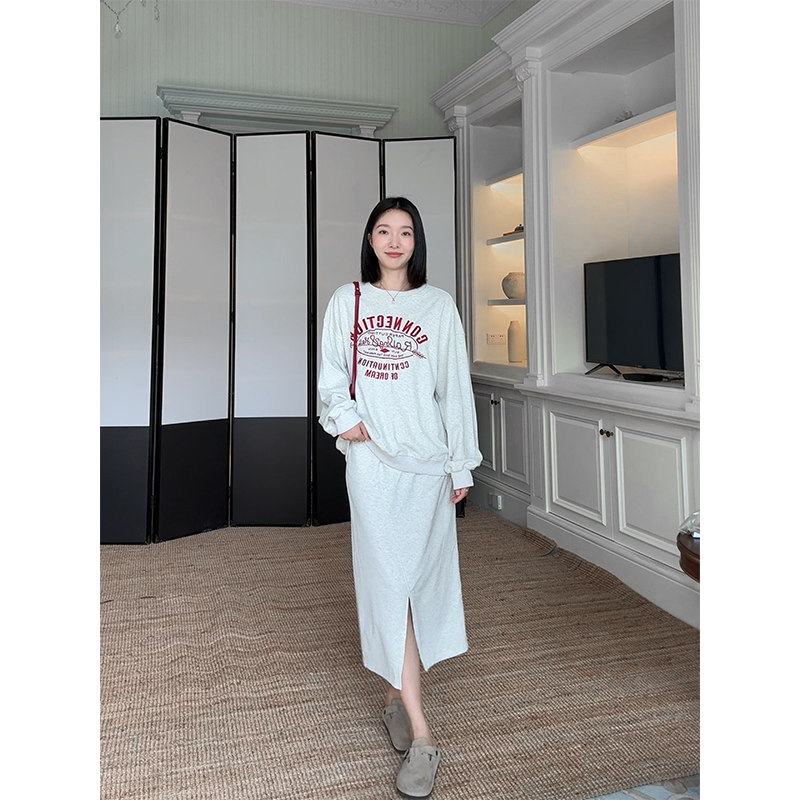 郭九九呢棉美式复古刺绣宽松薄款卫衣春季百搭上衣开叉显瘦半身裙