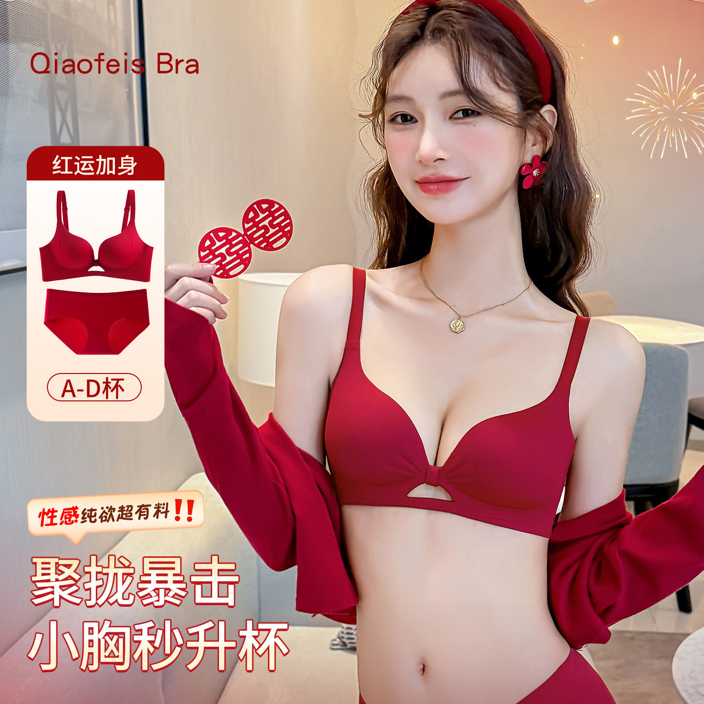 内衣套装小胸聚拢格子2025年新款本命年红色无痕调整结婚新娘胸罩