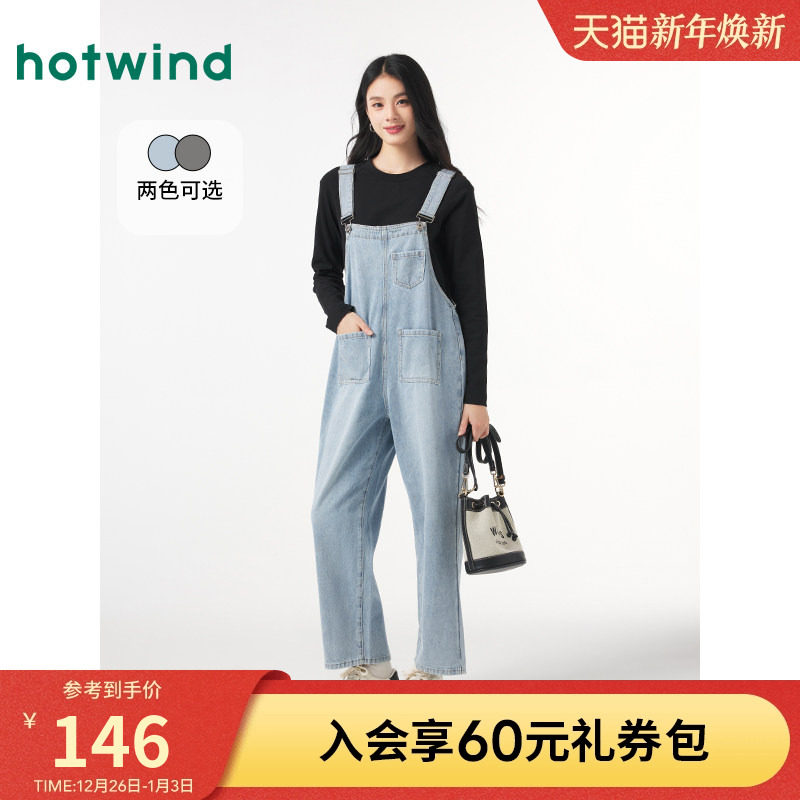 热风2025年春季新款女士中腰直筒背带牛仔裤宽松显瘦长裤百搭裤子