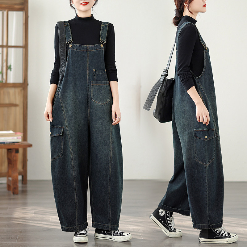 复古做旧工装牛仔阔腿背带裤女秋装大码时髦宽松显瘦休闲连体长裤