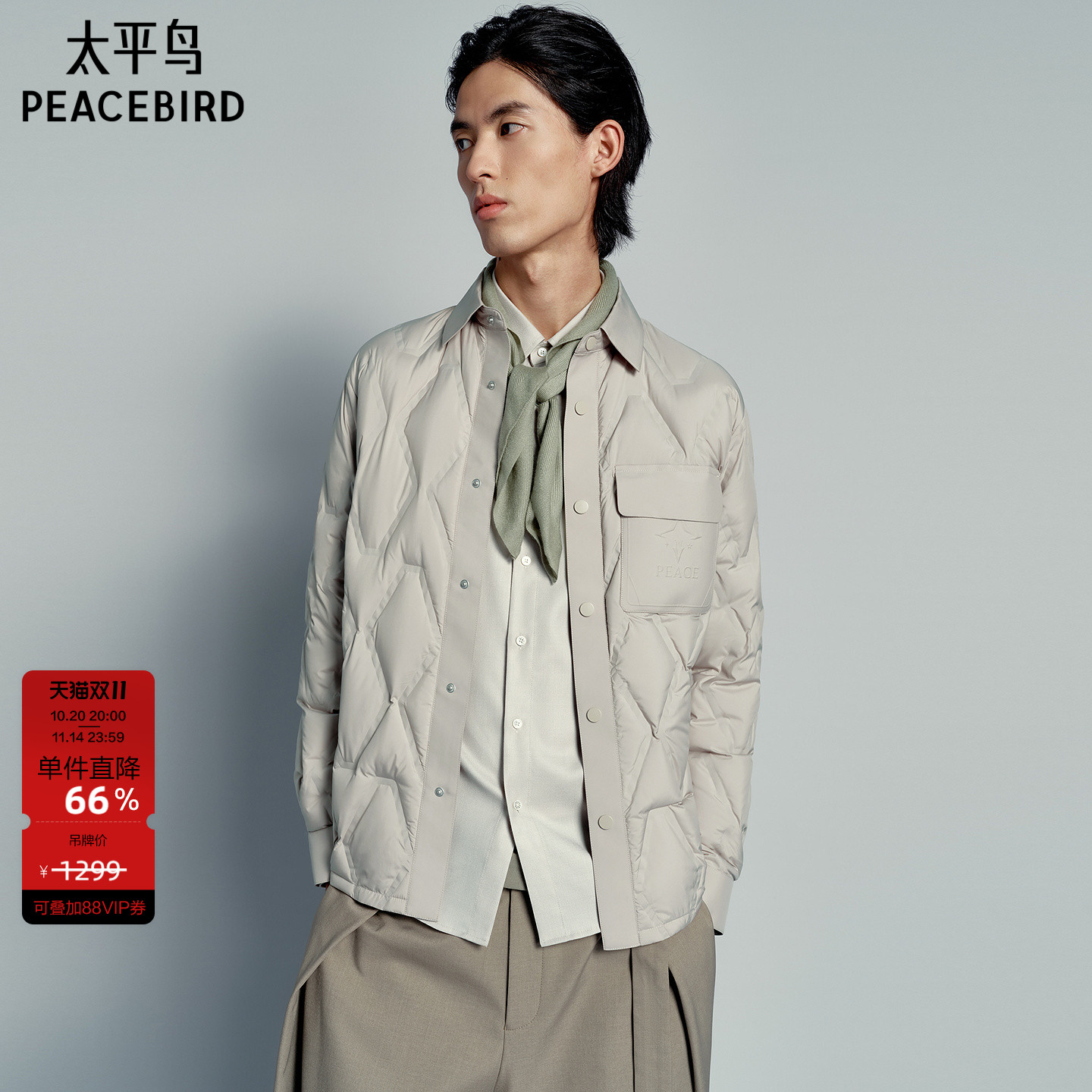【老花】太平鸟男装 轻薄羽绒服冬季短款衬衫式保暖翻领防寒夹克