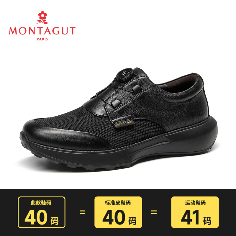 梦特娇秋季真皮男鞋懒人旋转扣厚底增高全黑工作休闲旅游运动皮鞋