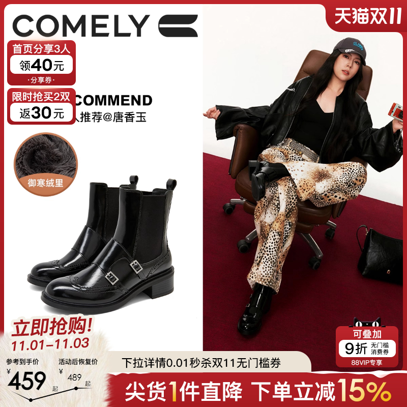 时装周同款康莉布洛克切尔西靴女25冬新款复古英伦风粗跟雕花短靴
