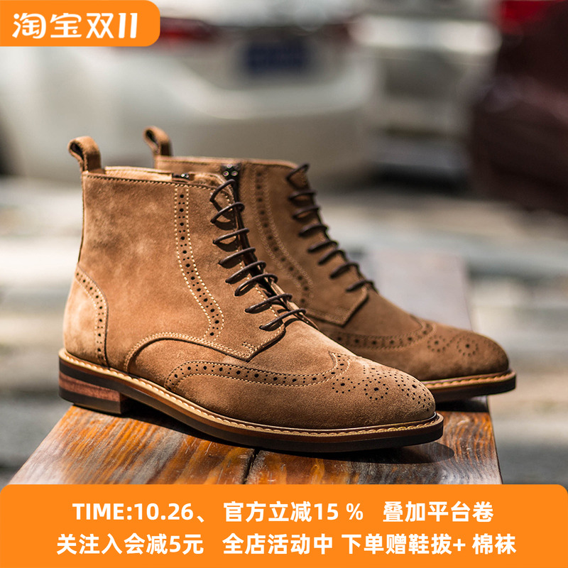 布洛克高帮皮鞋男系带圆头手工雕花反绒皮棕色透气英伦风休闲短靴