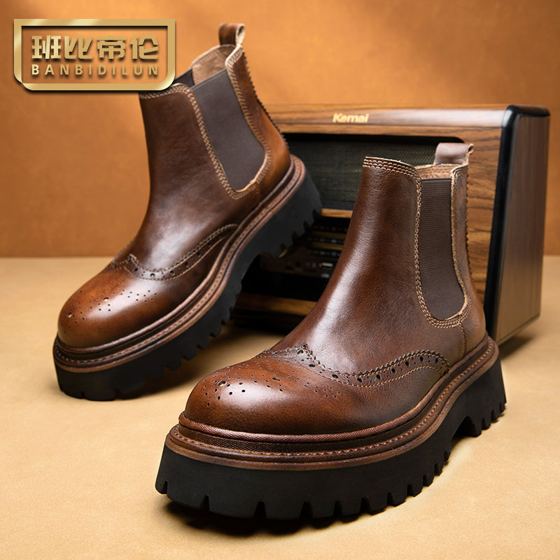 切尔西靴男士新款头层牛皮布洛克雕花短靴英伦潮流厚底加厚马丁靴