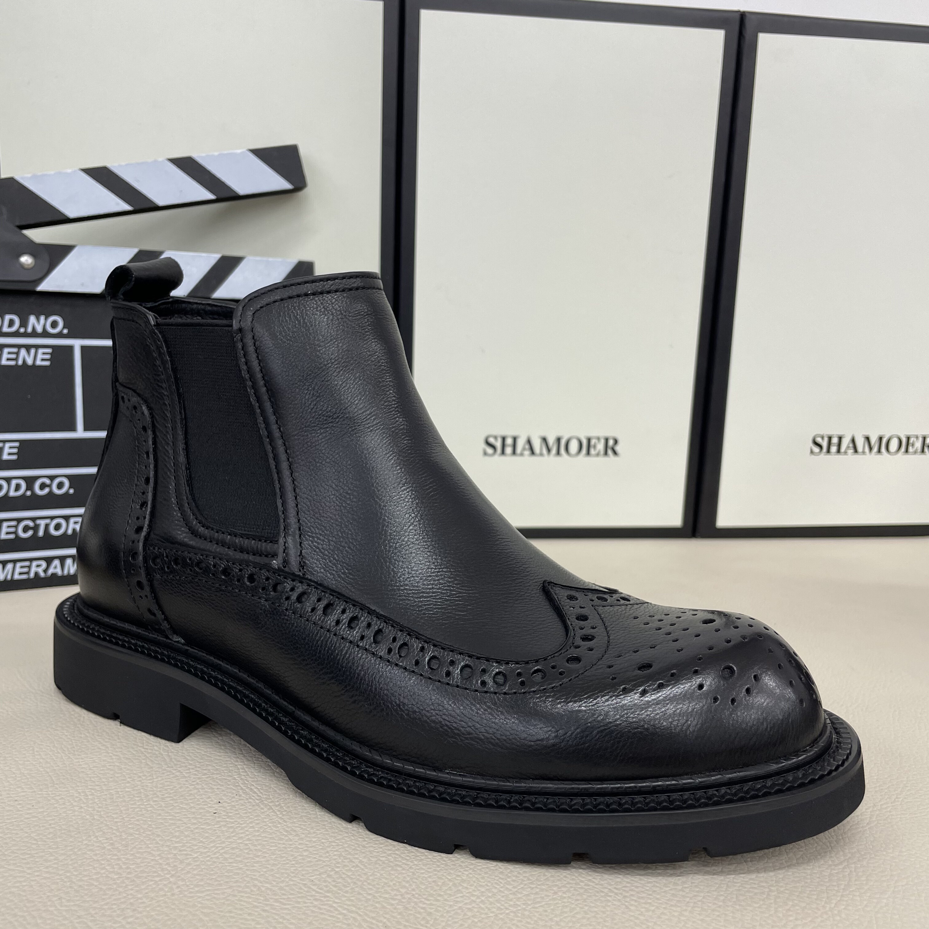 CW2025新款春季切尔西靴男真皮短靴英伦风马丁靴布洛克雕花厚底黑