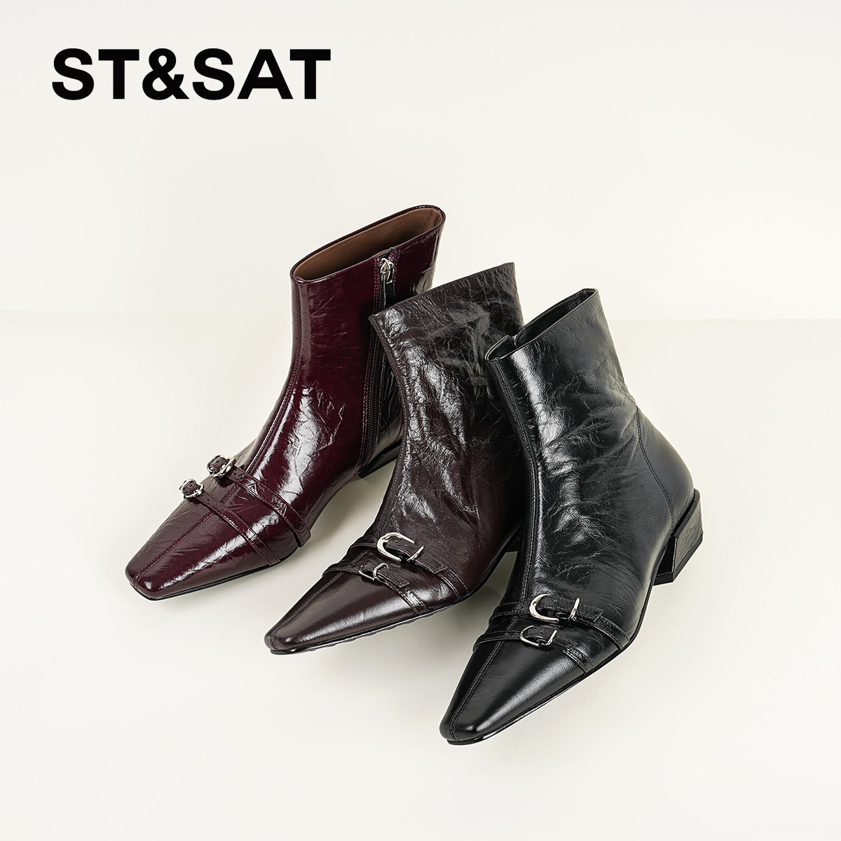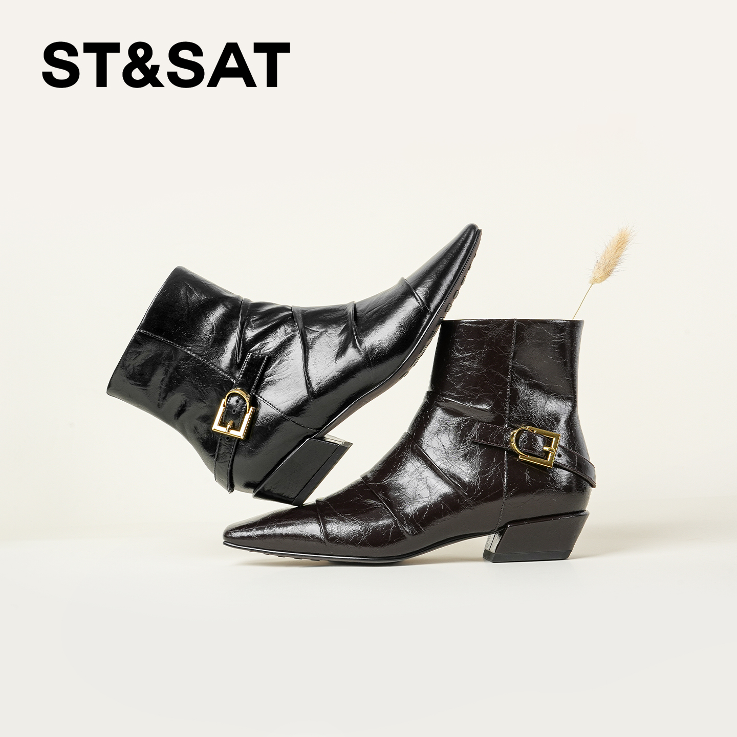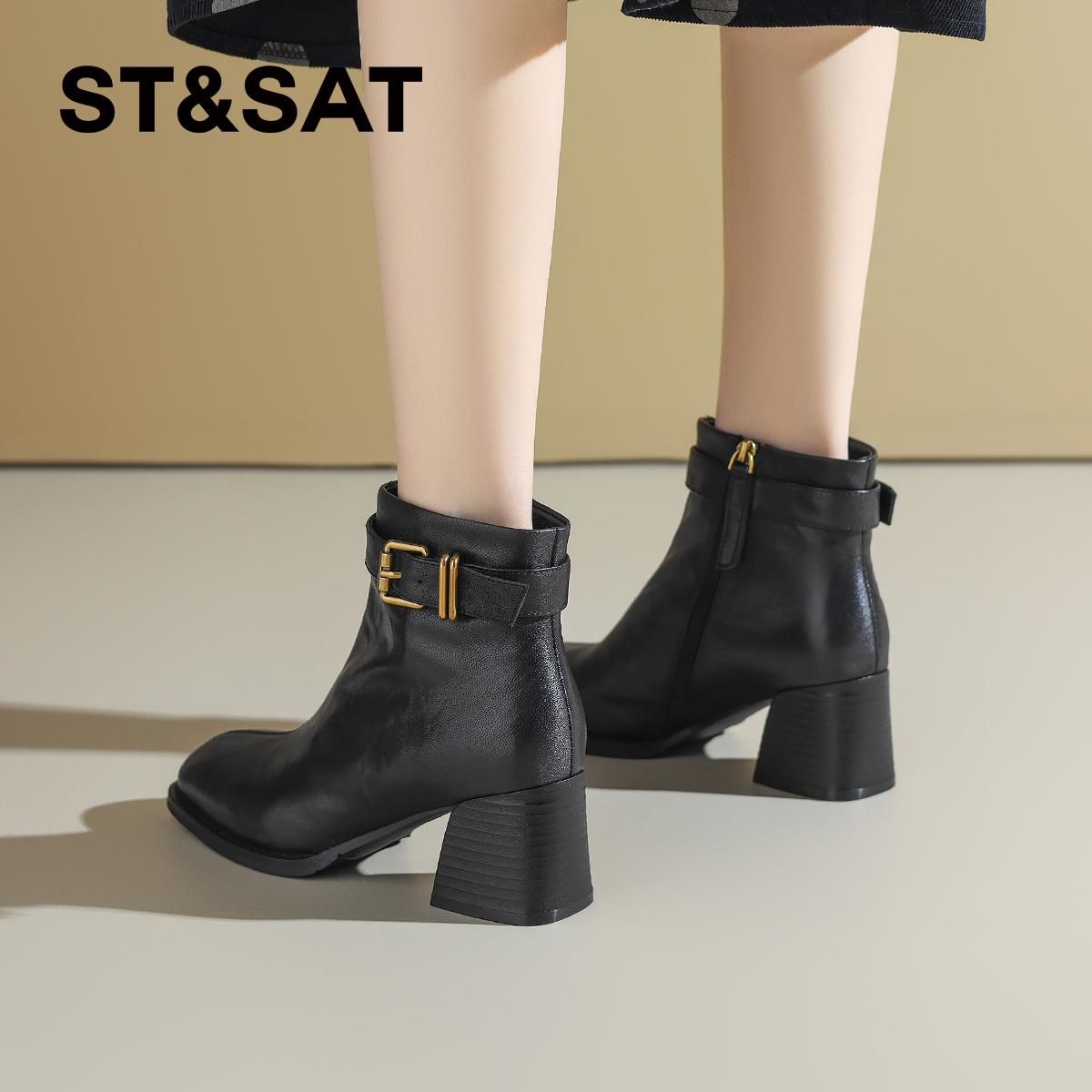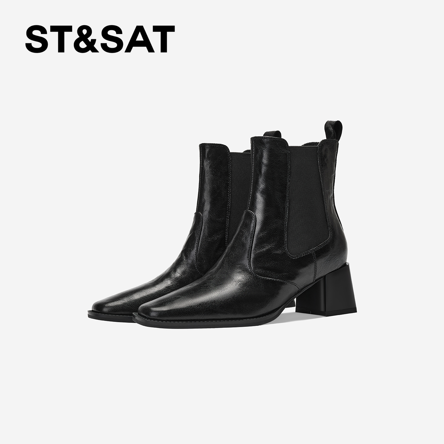 星期六法式时装靴2025秋冬方头粗跟全真皮短靴真皮百搭切尔西靴直