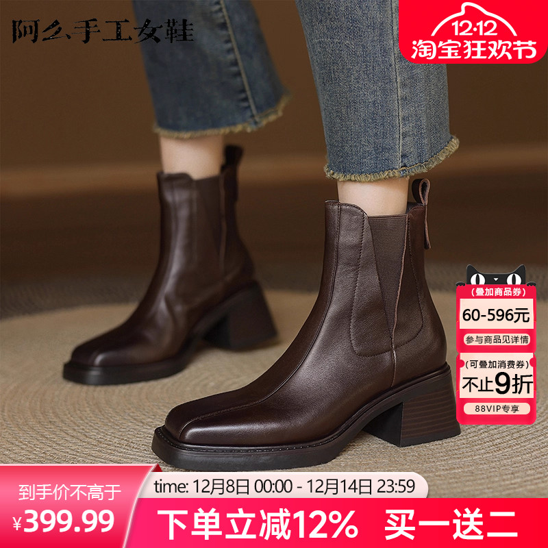 【明星推荐】阿么手工女鞋真皮弹力粗跟切尔西靴复古短靴秋冬新款