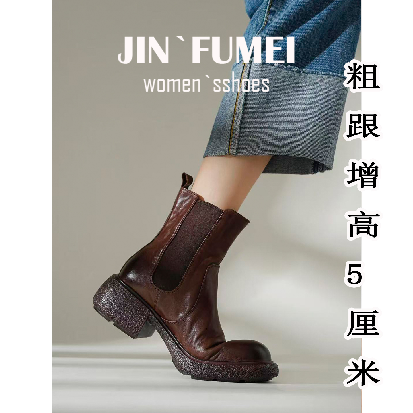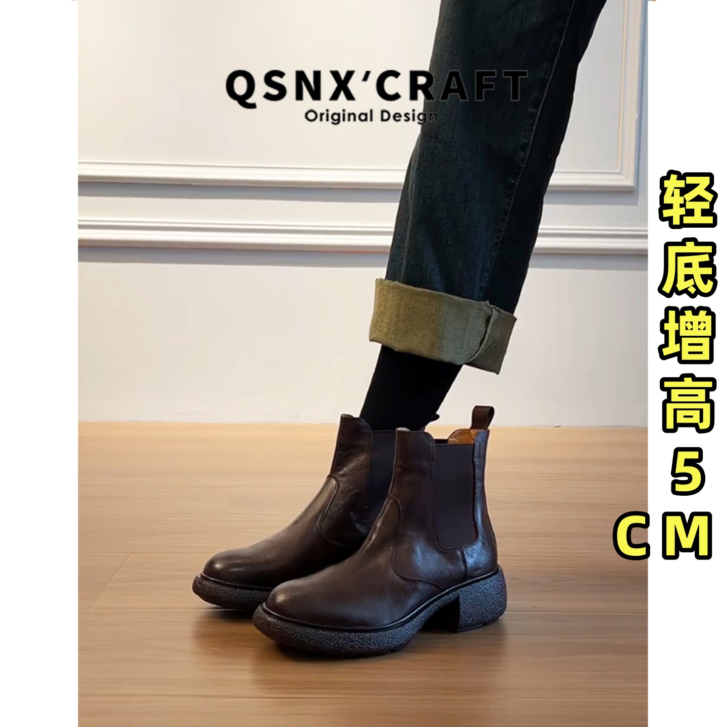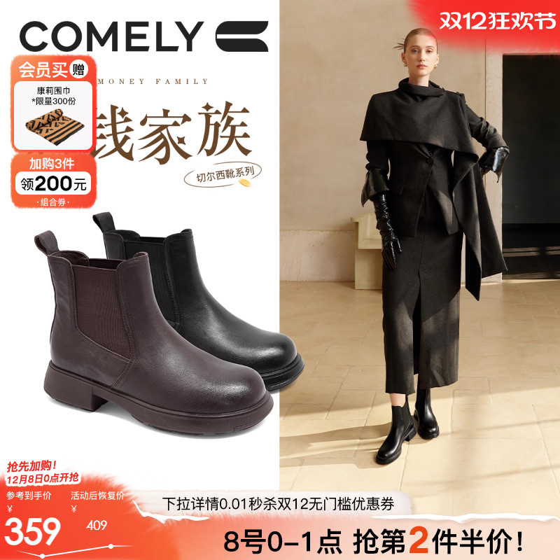 康莉真皮粗跟切尔西靴女25年冬季新款厚底增高复古加绒烟筒靴短靴