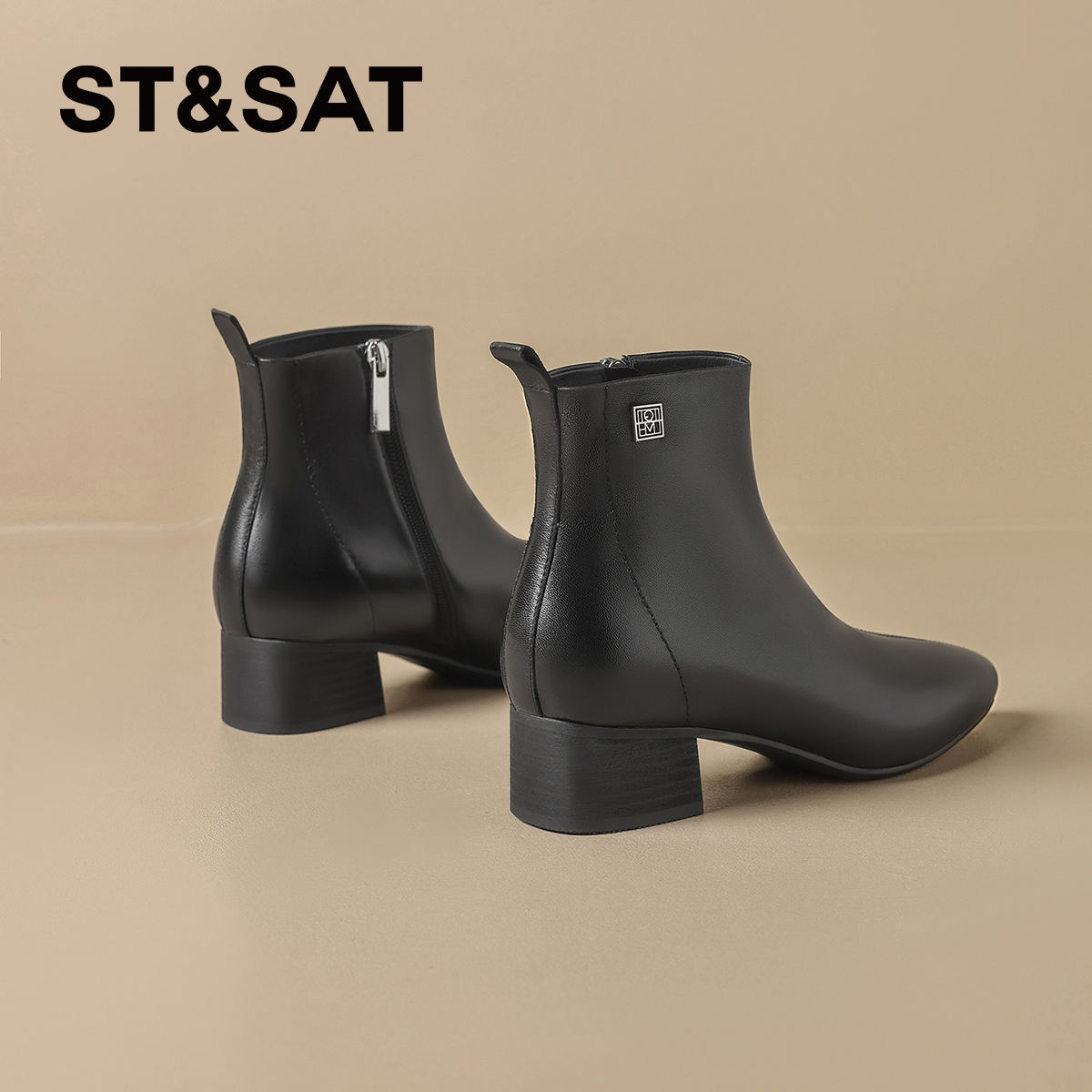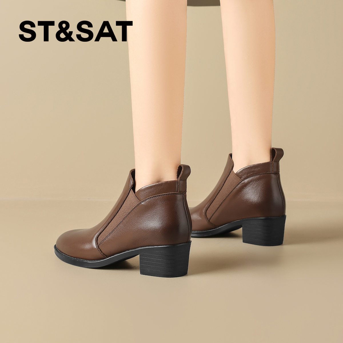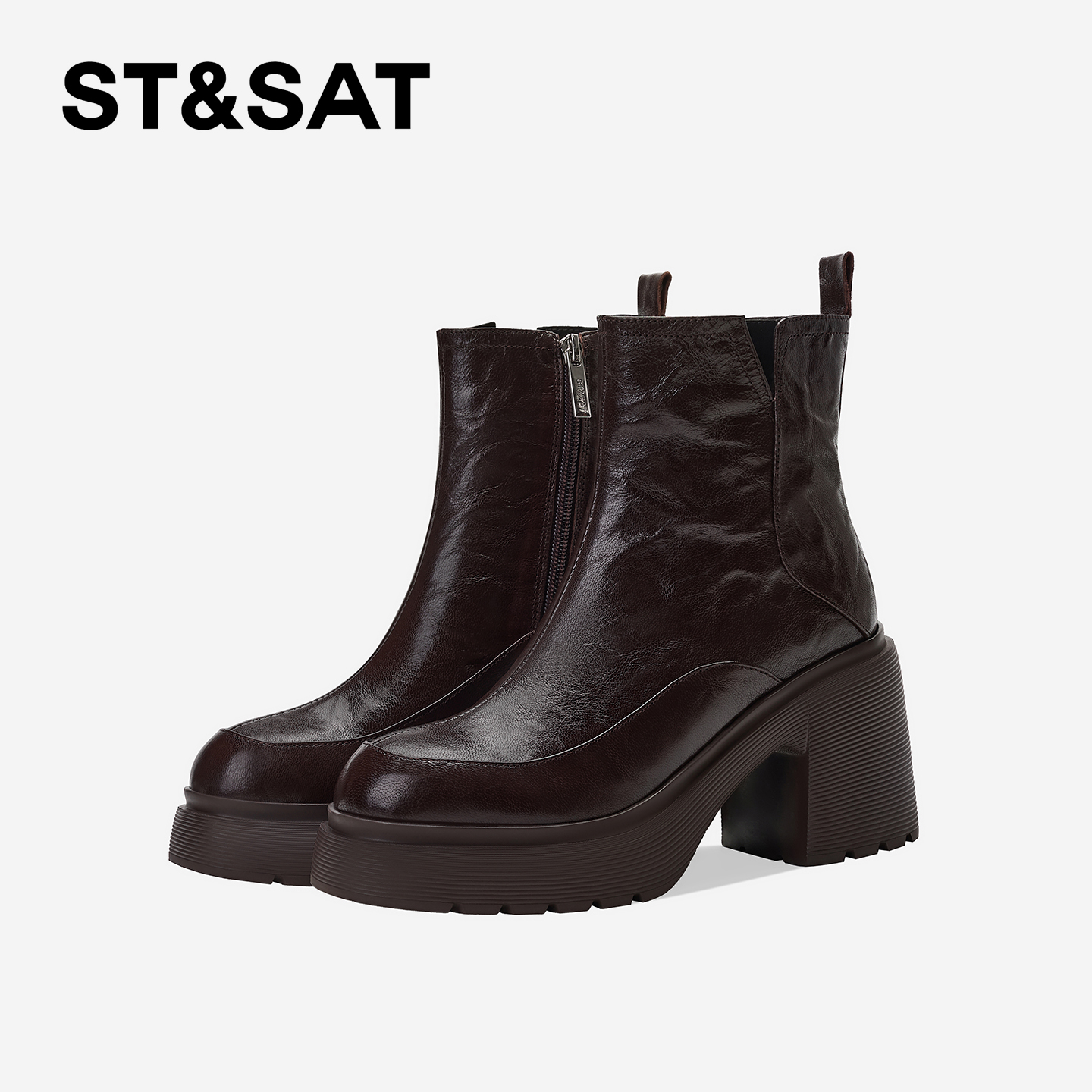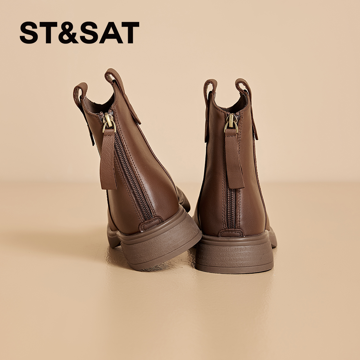 星期六棕色时装靴女2025秋冬方头粗跟后拉链短靴真皮英伦切尔西靴