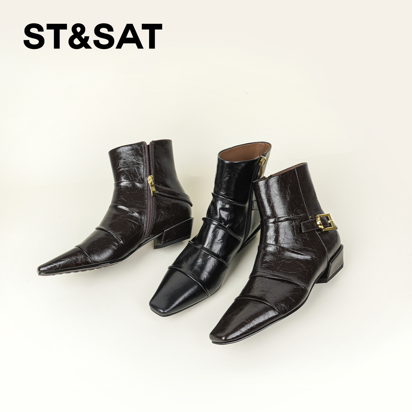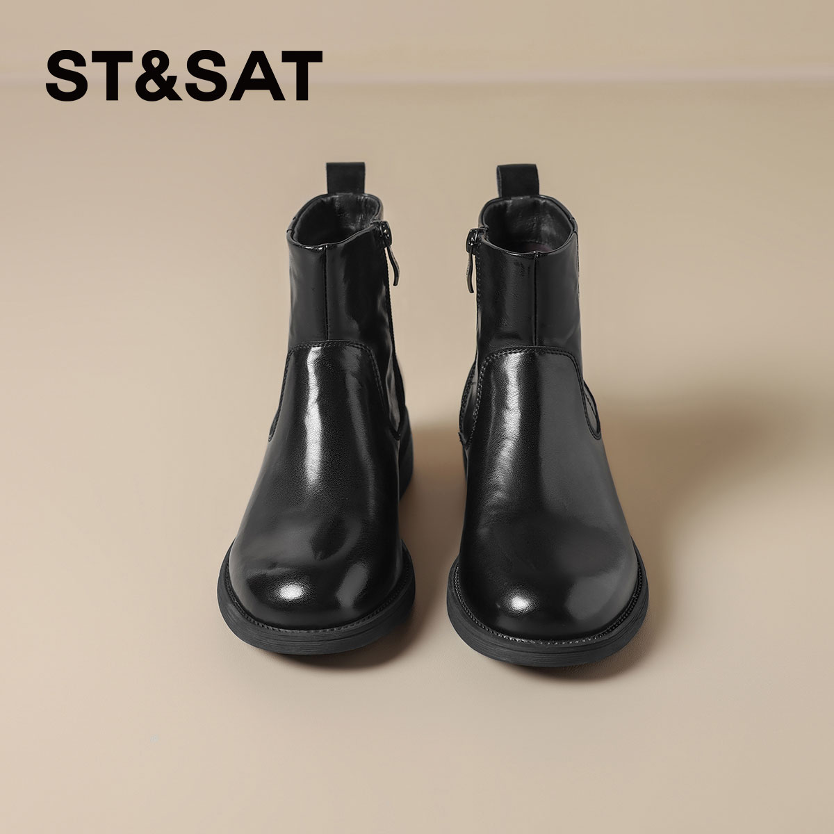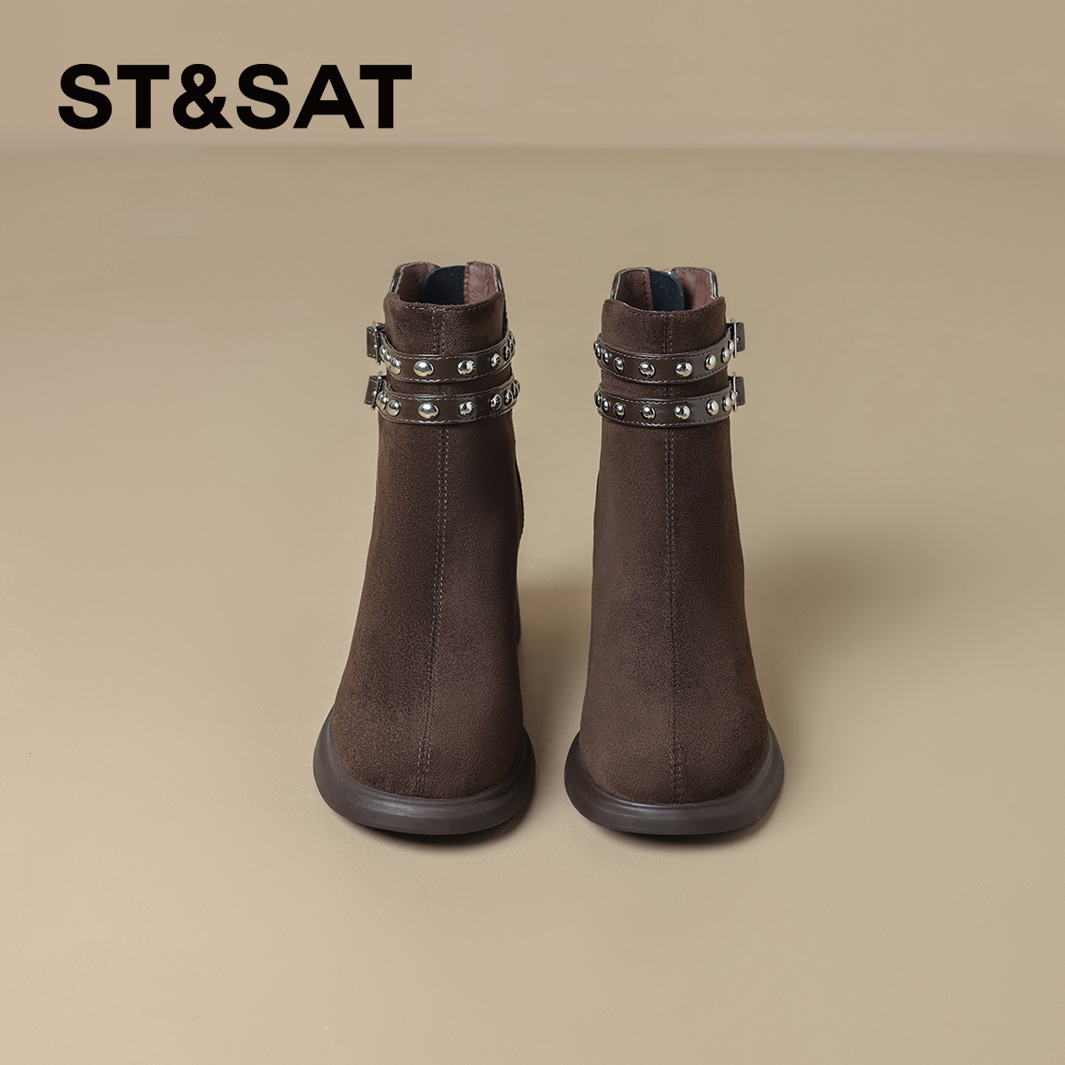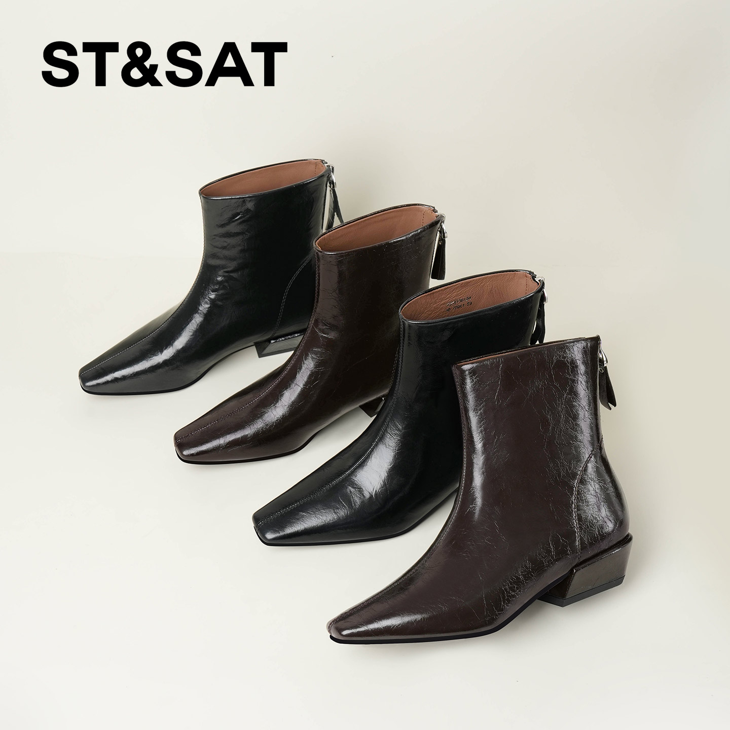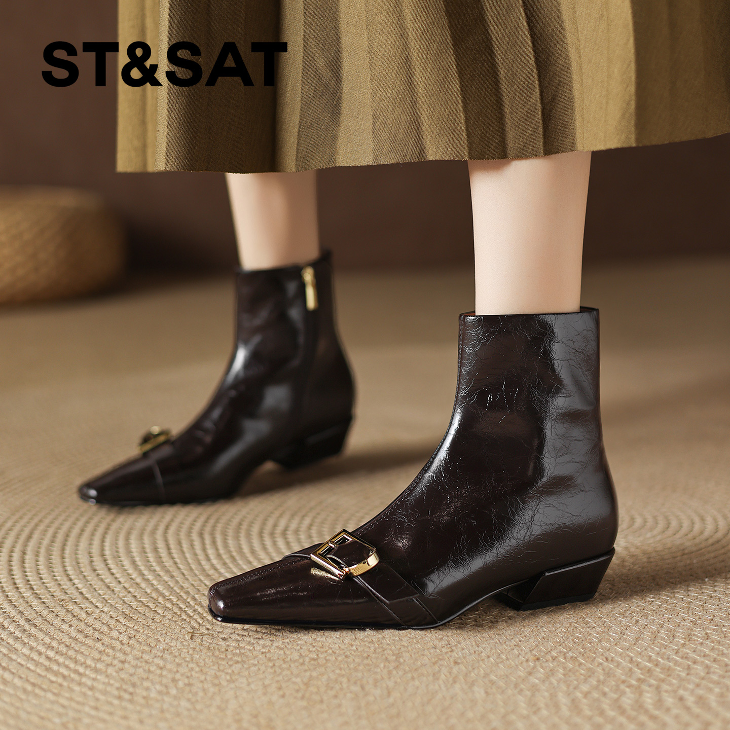 星期六棕色时装靴女2025秋冬方头粗跟后拉链短靴真皮英伦切尔西靴