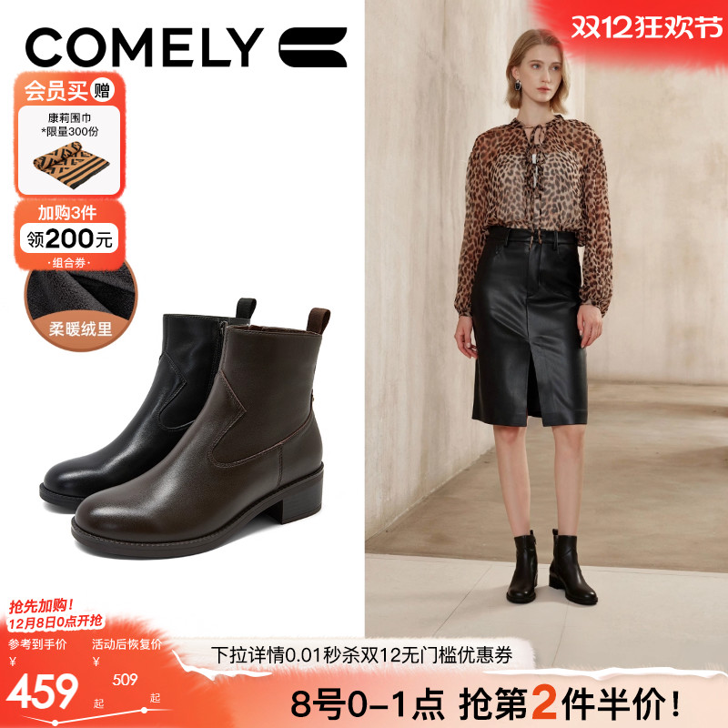 - 粗跟加绒短靴女冬
