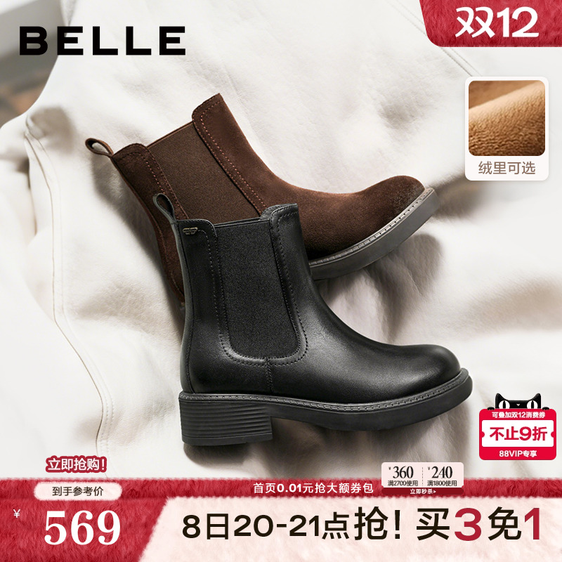 百丽复古真皮加绒保暖切尔西靴子女冬款棉鞋粗跟休闲短靴E8M1DDZ5