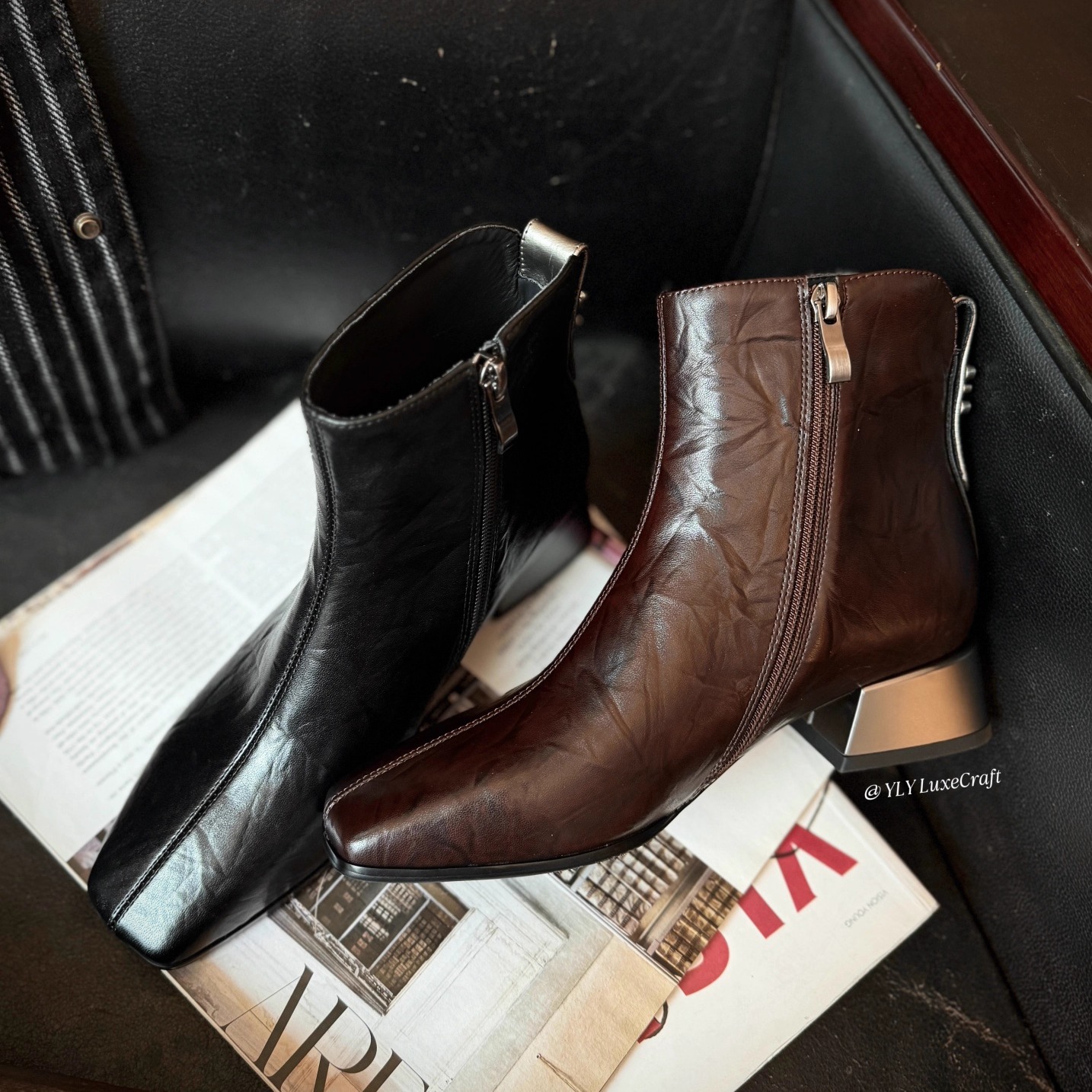 1802-50秋冬季短靴女2025新款粗跟中跟侧拉链真皮方头百搭切尔西
