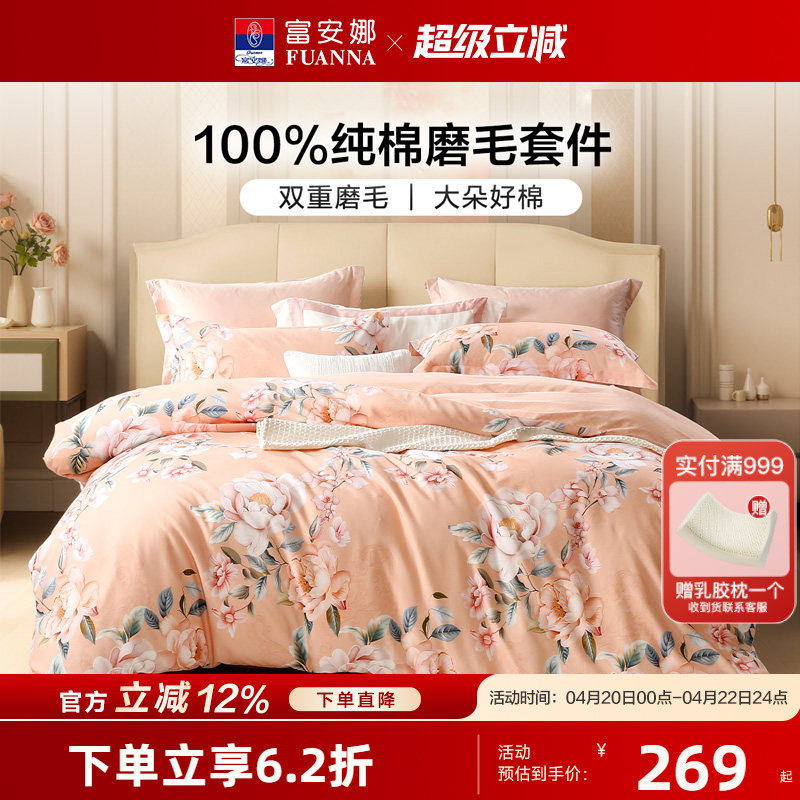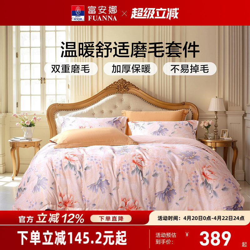 富安娜纯棉磨毛加厚四件套60支长绒棉套件全棉保暖被套春秋季产品
