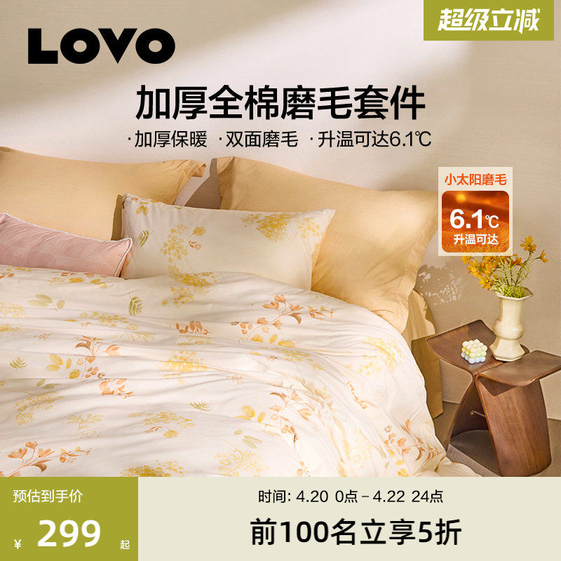 罗莱家纺LOVO磨毛加厚四件套全棉纯棉被套三件套床单秋冬季保暖