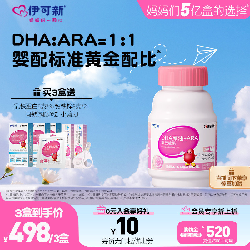 伊可新婴幼儿dha藻油凝胶糖果儿童宝宝婴儿软胶囊特含ARA官方正品