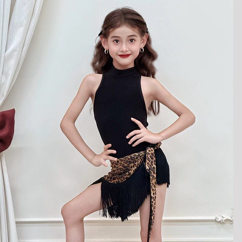 2026新款演出服拉丁舞服女童大露背上衣分体网红流苏豹纹包臀短裙