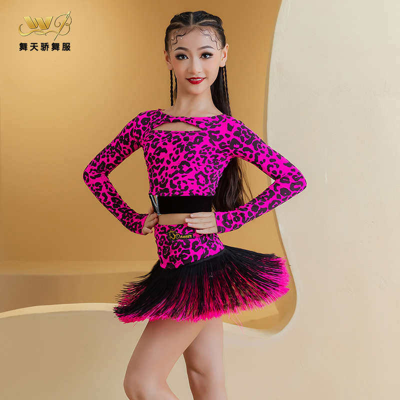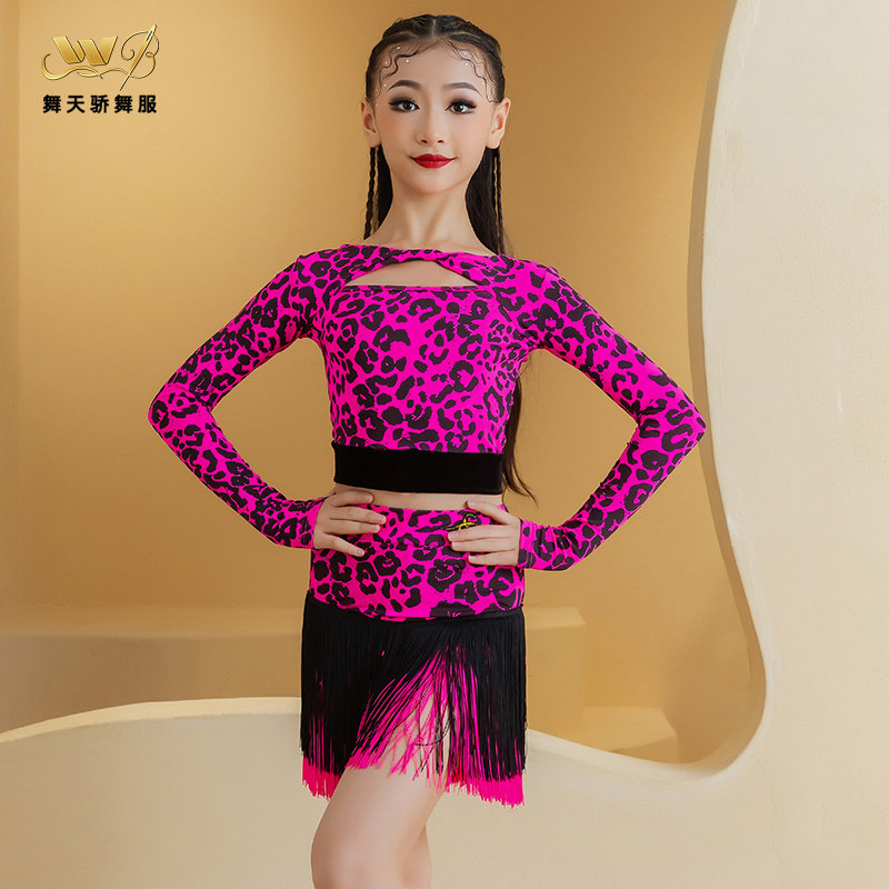 舞天骄新品秋冬长袖玫红豹纹流苏拉丁舞服少儿女童撞色演出服班服