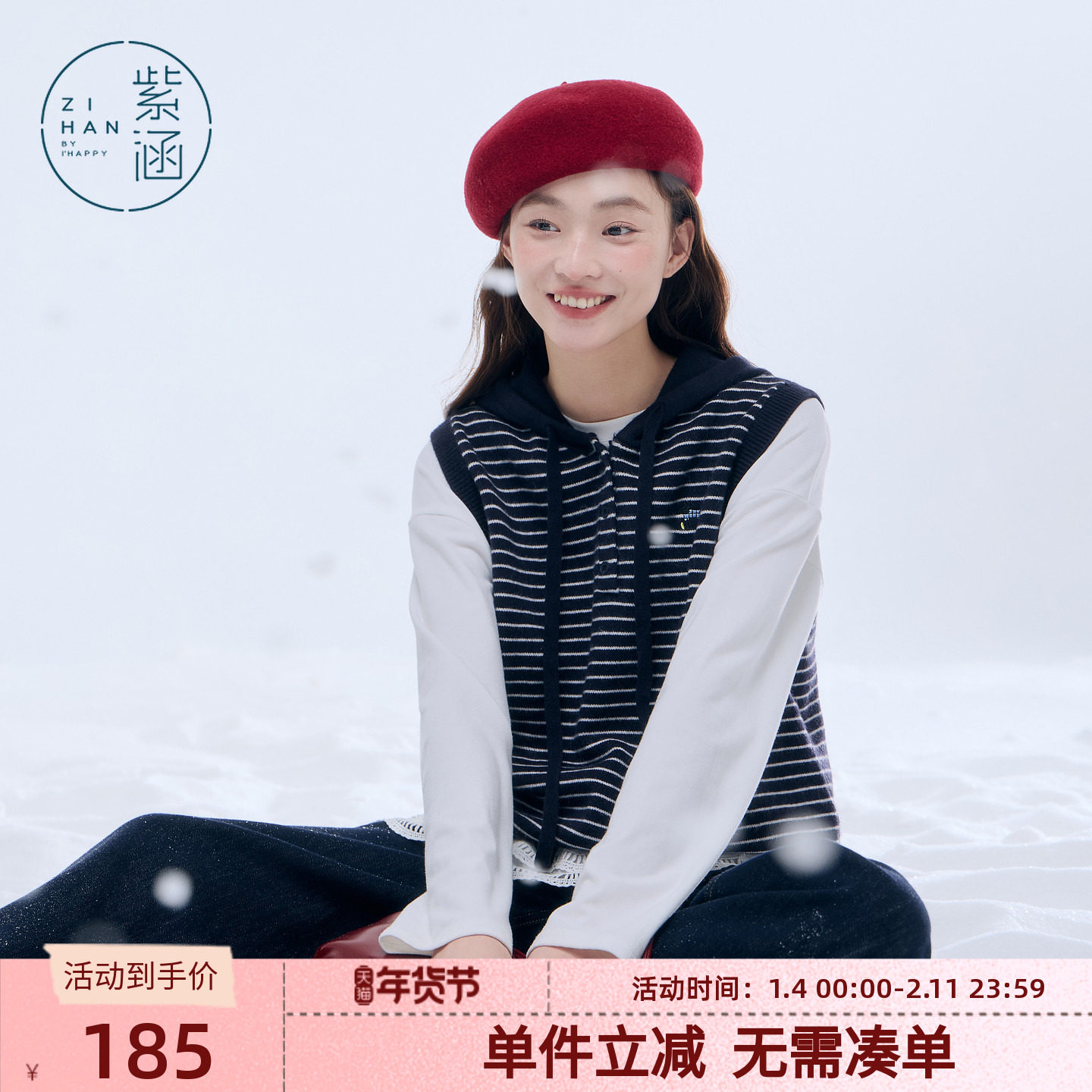 紫涵连帽无袖针织马甲女2025年冬季新款撞色条纹叠穿套头马夹背心