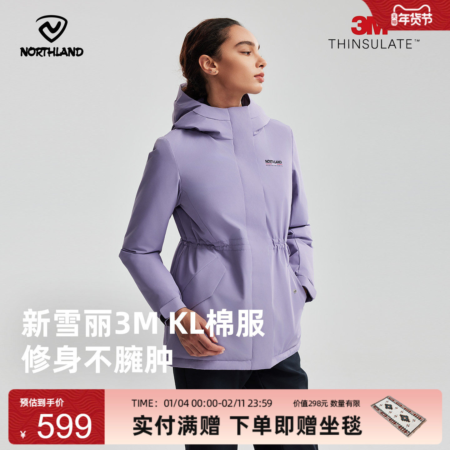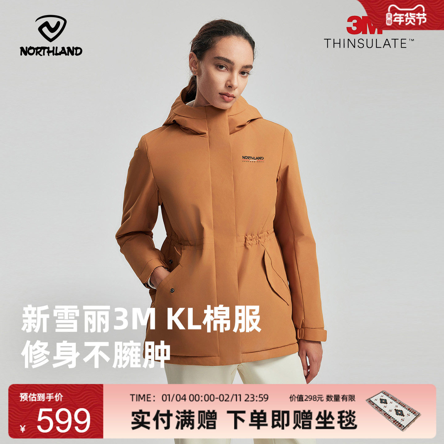 诺诗兰棉服3M女25秋冬新防风保暖户外徒步登山中长款修身连帽外套