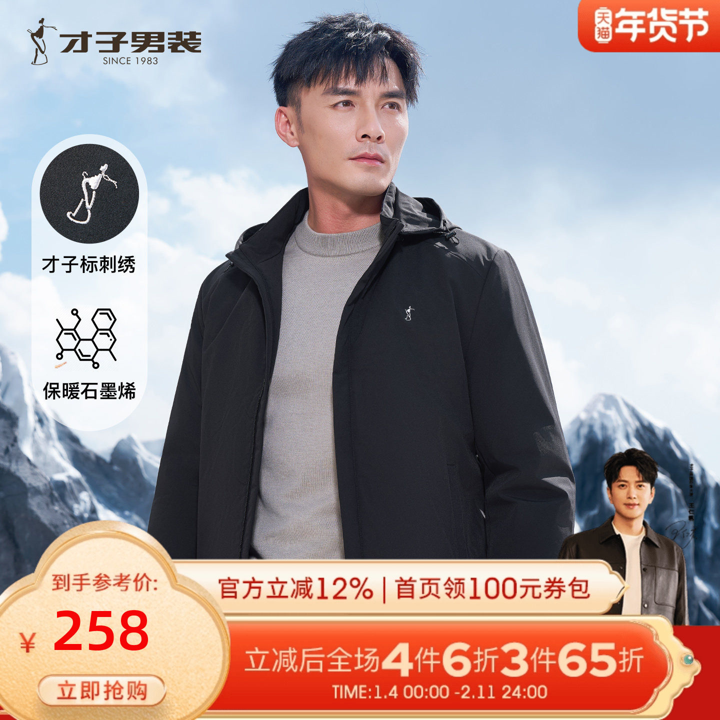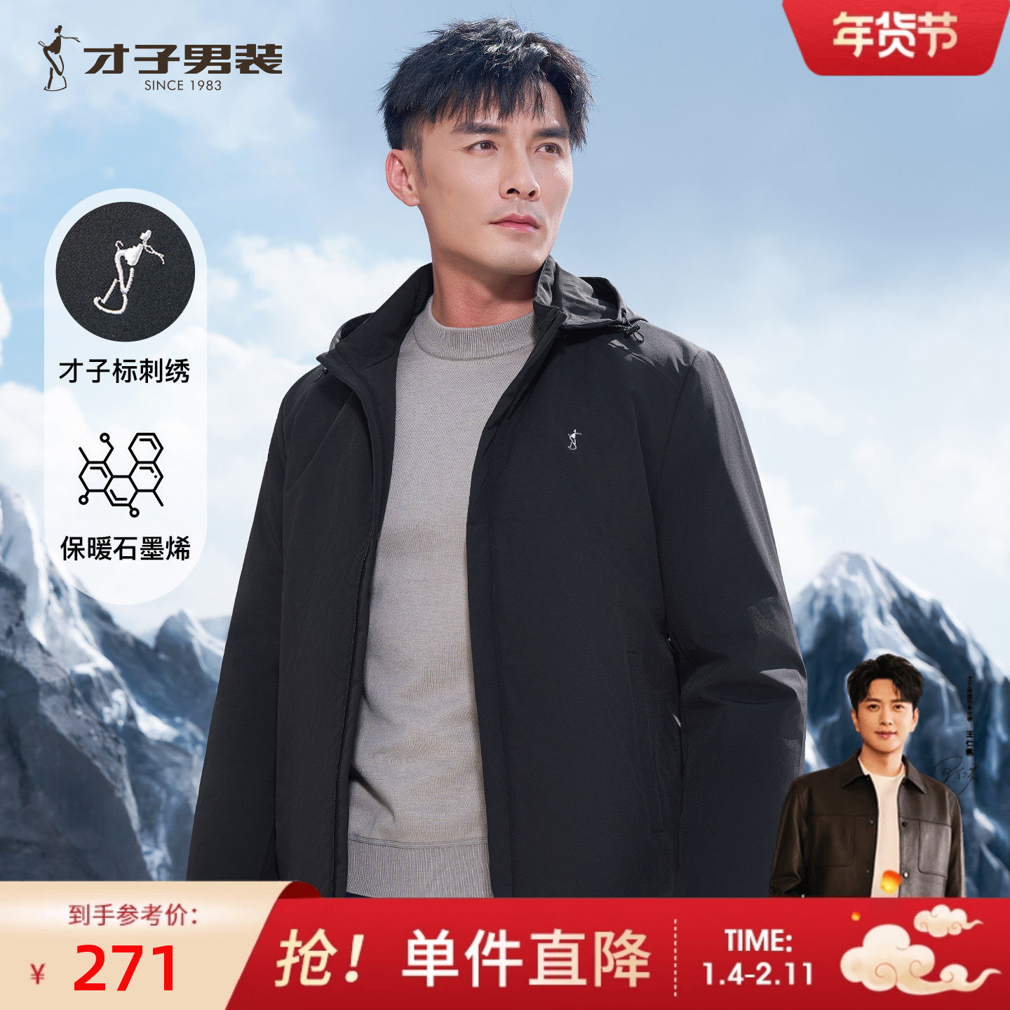 才子可拆卸连帽棉服男士2025冬季新款修身商务休闲石墨烯棉衣外套