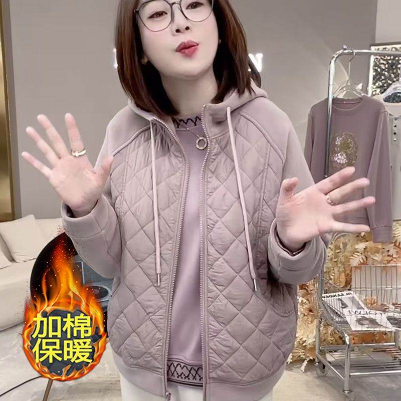 棉衣女2025秋冬新款连帽修身轻薄纯色气质夹棉条纹百搭上衣外套女