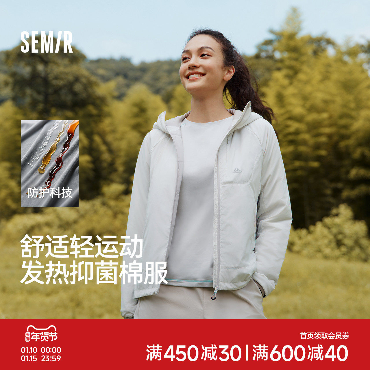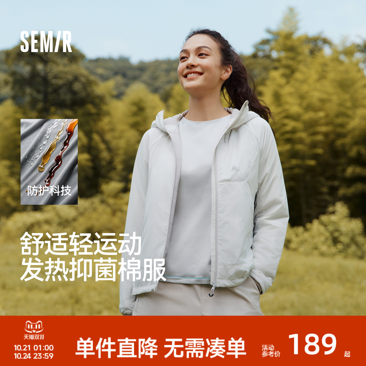 森马棉服女三防户外插肩袖修身连帽2025新款冬季发热抑菌轻薄内搭
