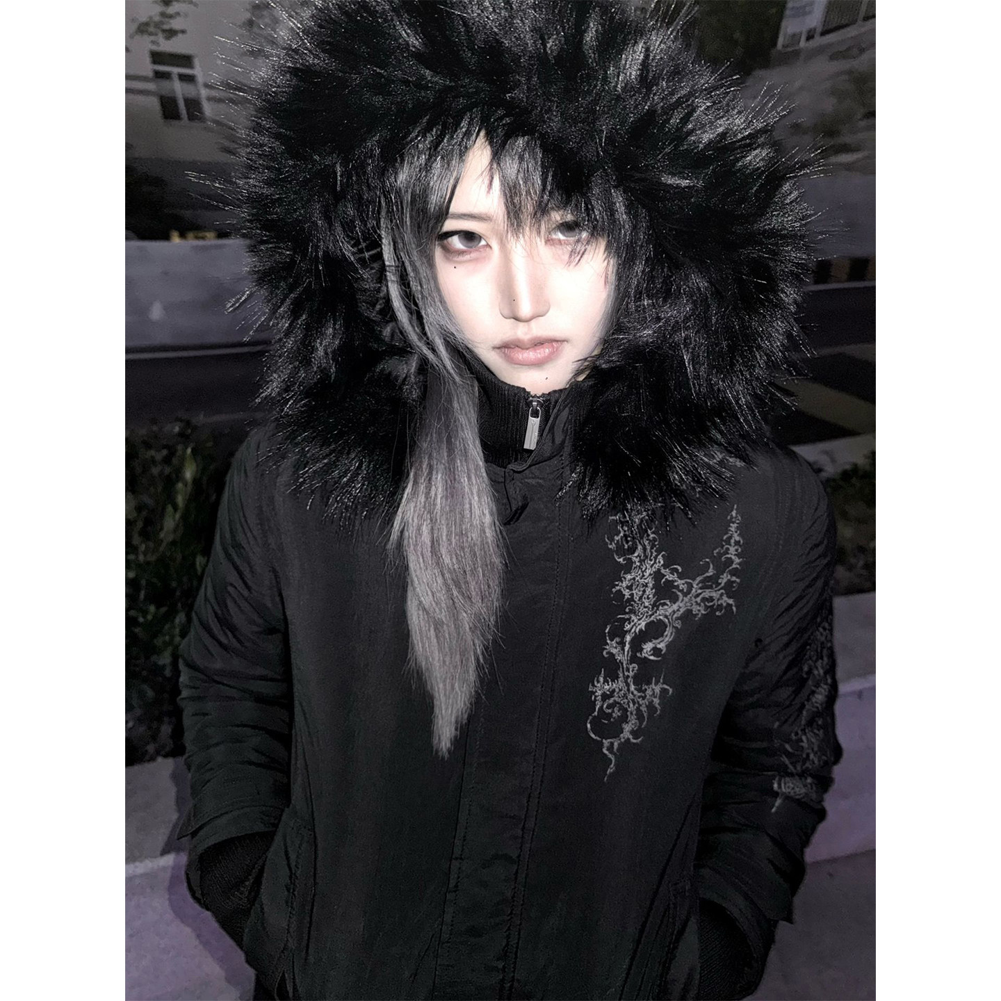 亚文化黑色连帽棉服女冬季可拆卸毛领加厚保暖修身y2k视觉系外套