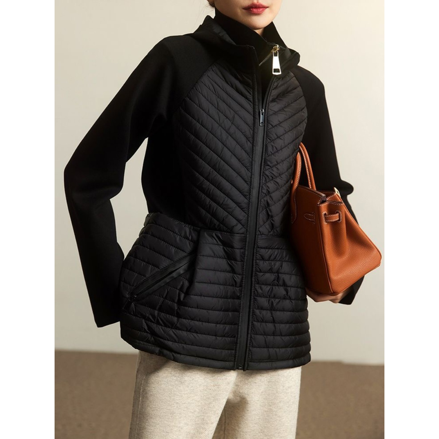 西班牙D~秋冬款连帽空气棉长袖修身拼接轻薄绗缝羽绒棉服女短外套