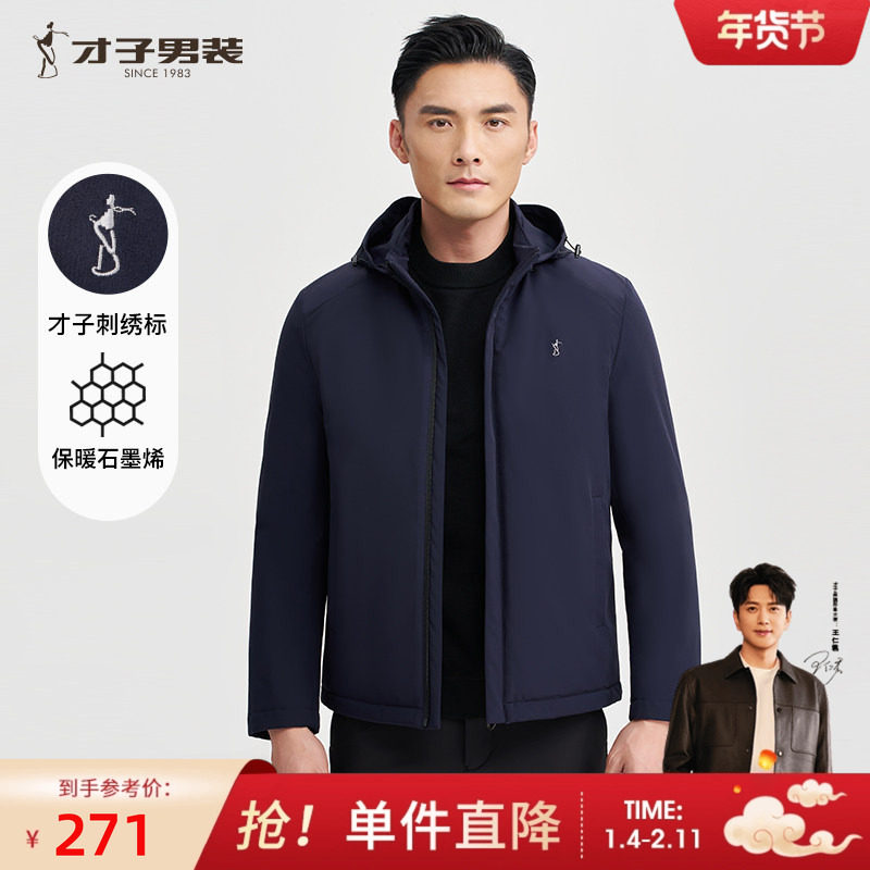 才子可拆卸连帽棉服男士2025秋冬新款修身商务休闲石墨烯棉衣外套