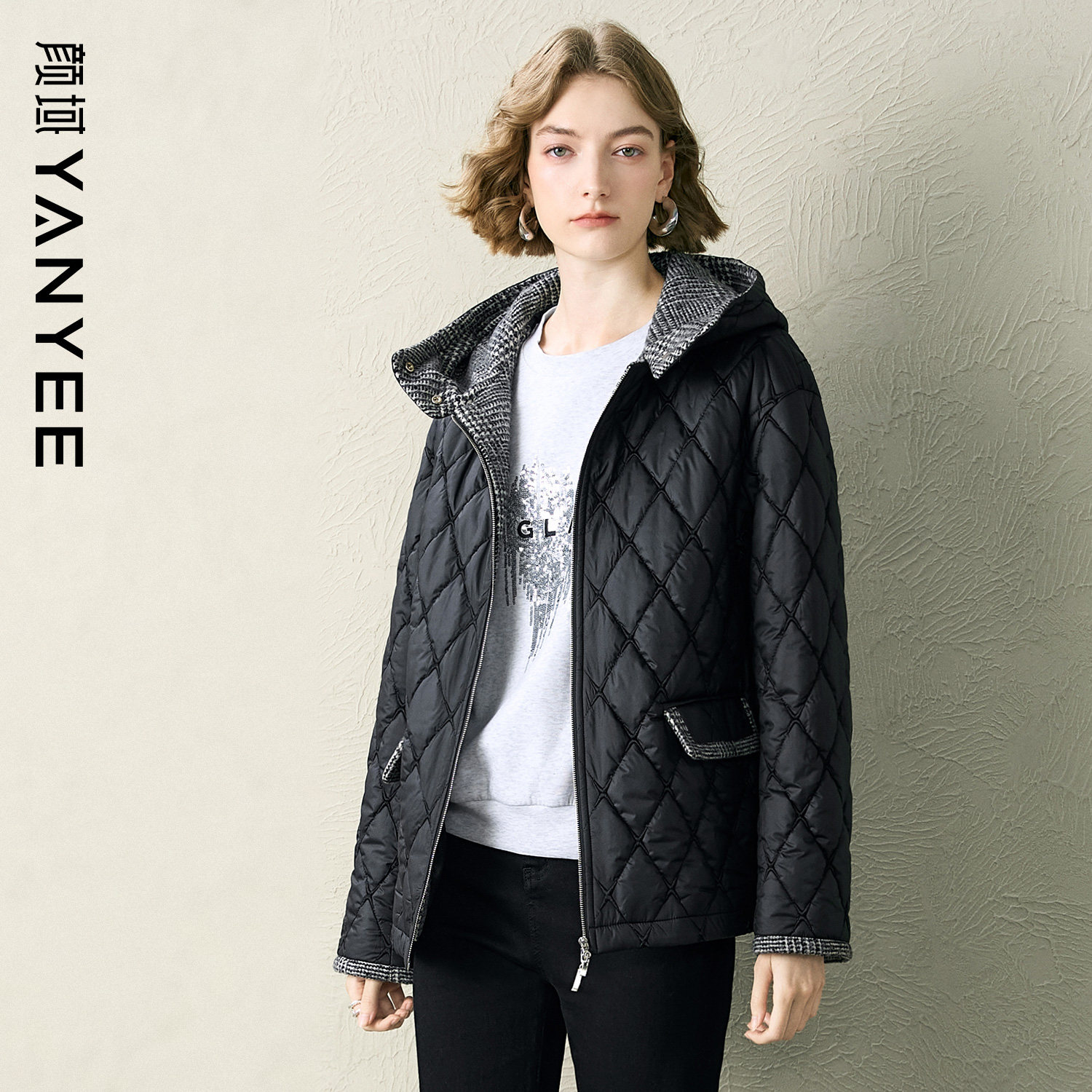 颜域连帽修身棉衣女士2025冬季新款通勤简约保暖短款修身棉服外套
